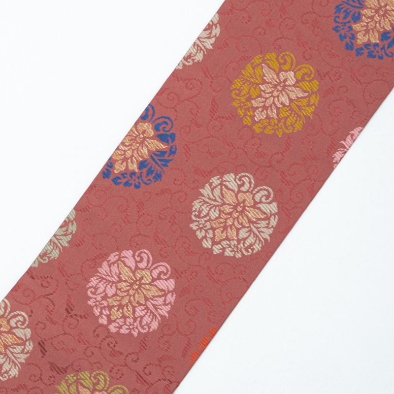 名古屋帯 唐花丸紋 赤紫色 九寸 正絹のお品です。