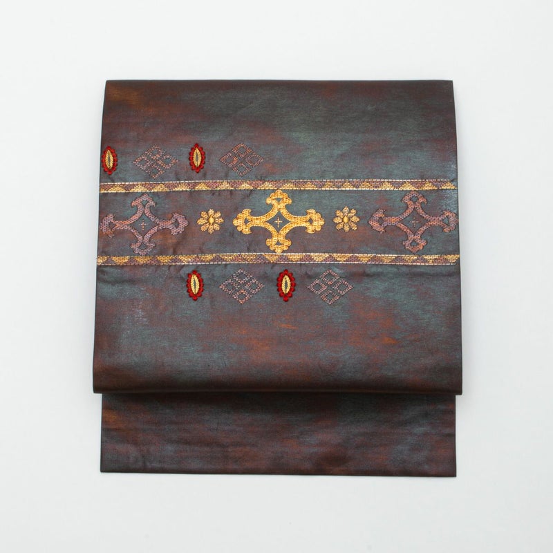 名古屋帯 引箔 刺繍 オリエンタル柄 焦茶色 九寸 正絹のお品です。