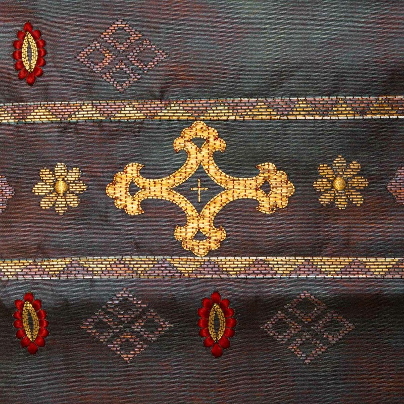落ち着いた地色に、引箔の上品な光沢と刺繍によるオリエンタル調の文様が映え