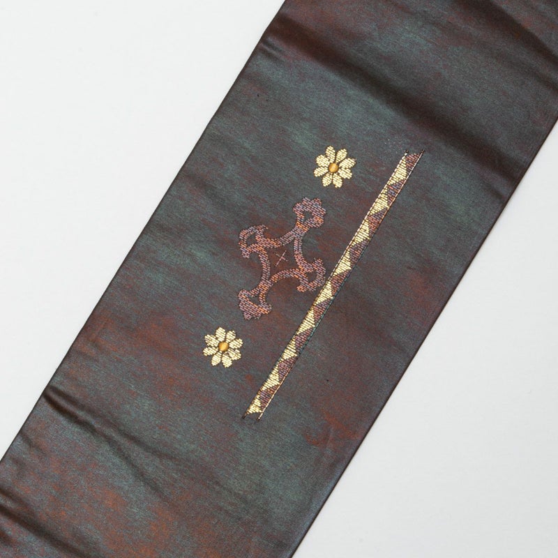 名古屋帯 引箔 刺繍 オリエンタル柄 焦茶色 九寸 正絹 リサイクル 1