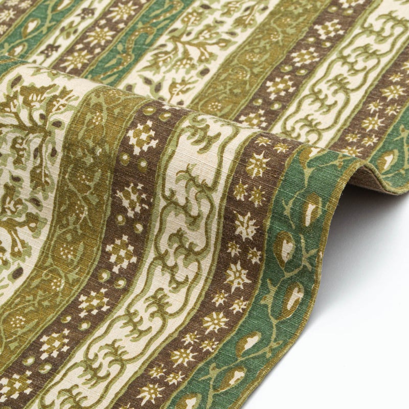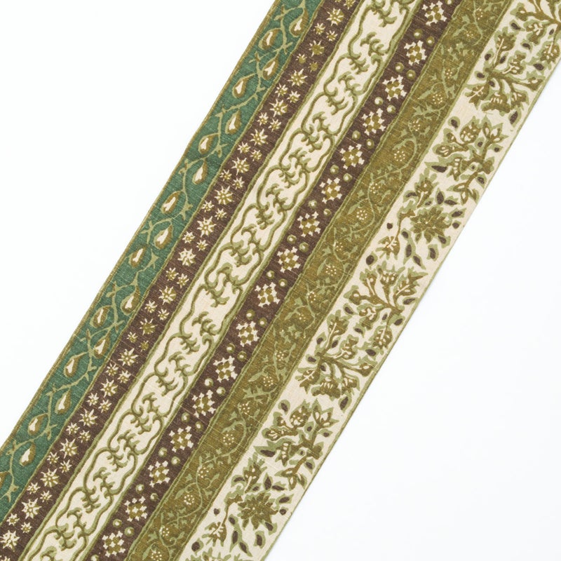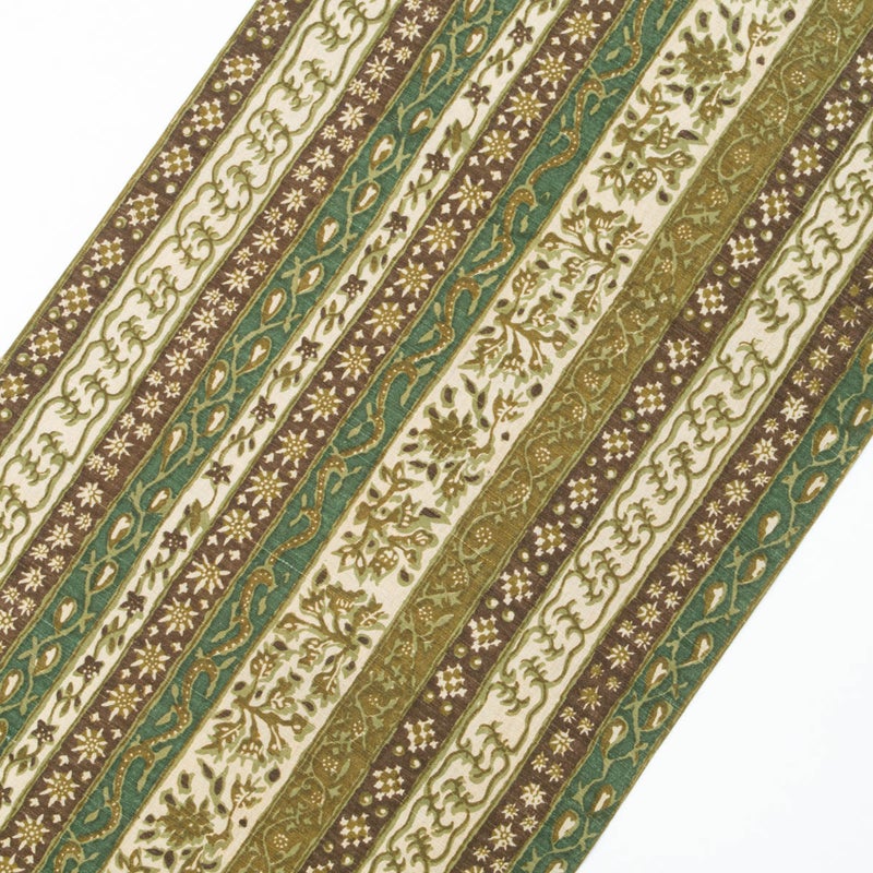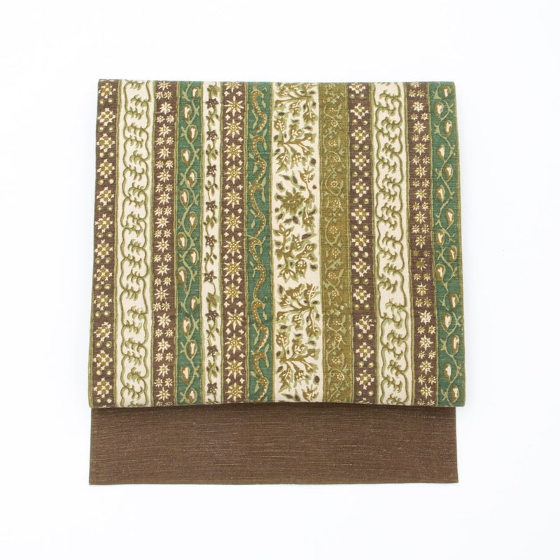 縞を基調に唐花草文様をあしらい、全体を統一している緑の配色が自然な趣と落ち着きを感じさせます。