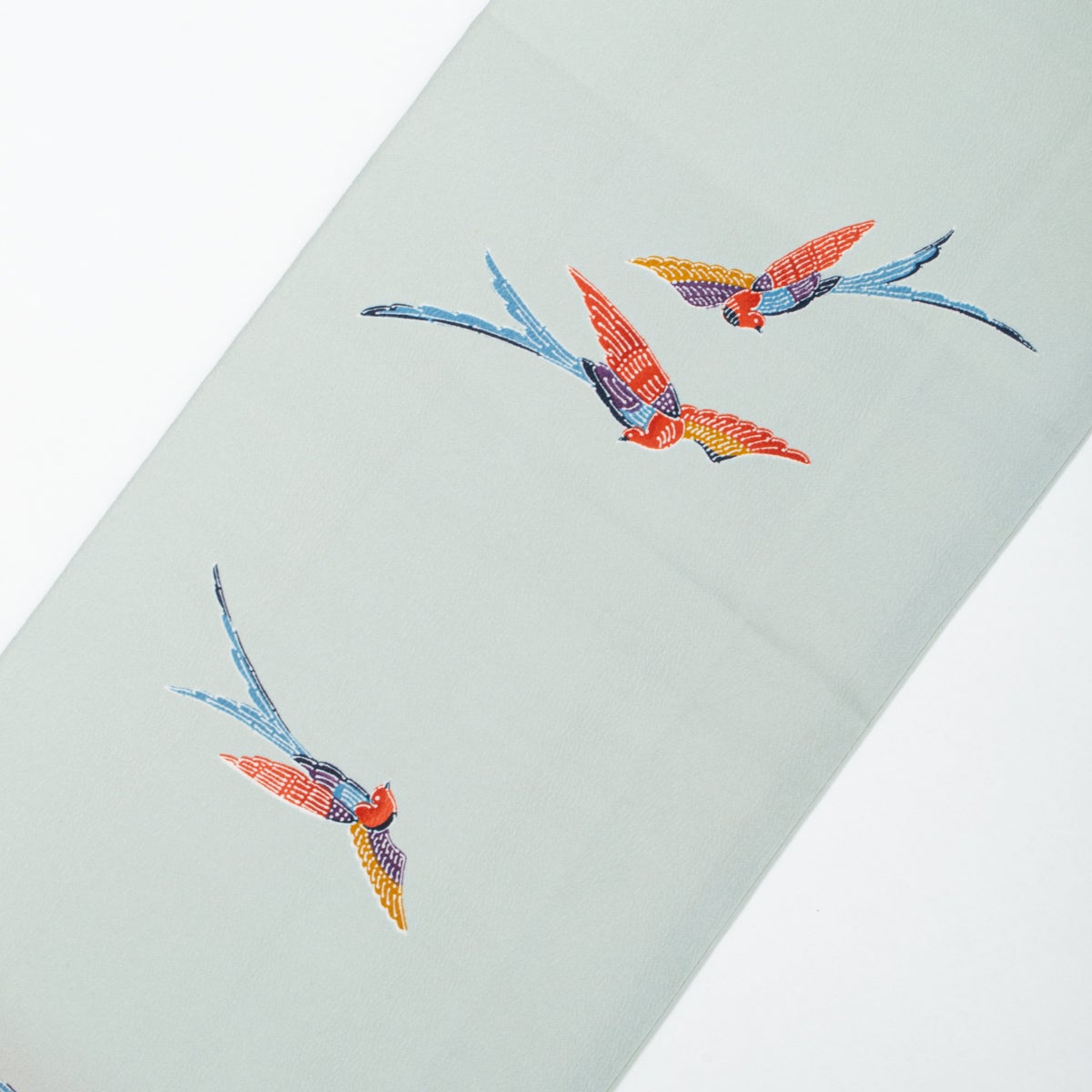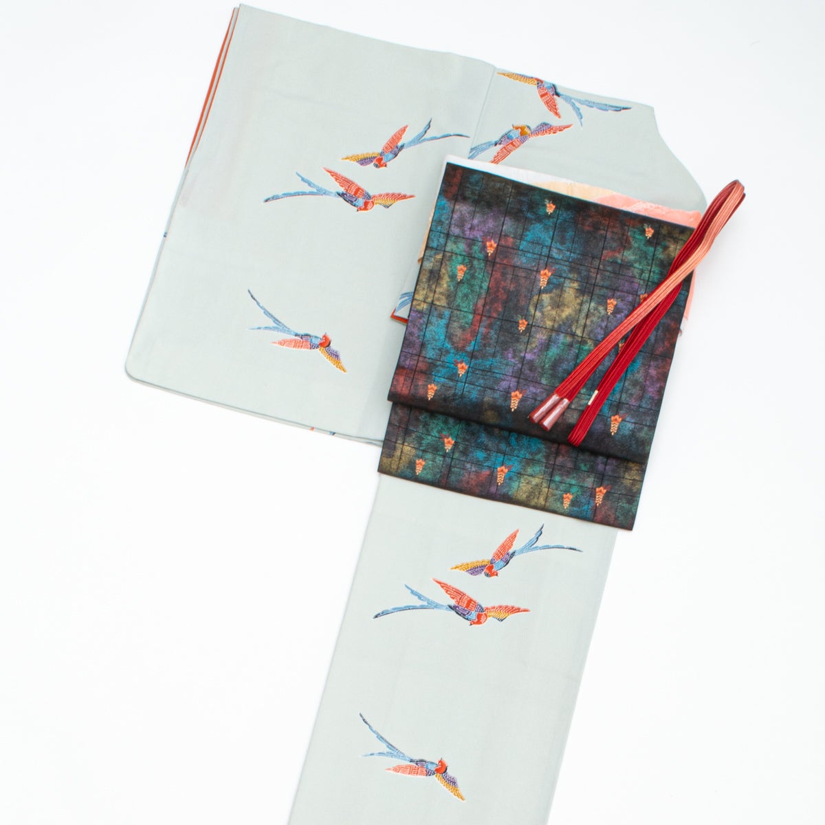 他の画像を見る 【小柄な方へおすすめ!コーディネート】小紋 縮緬 型絵染 鳥柄 淡い青緑色 マルチカラー と名古屋帯 引箔 黒色 九寸のコーデ 11 当店特別価格 ¥ 36,300 税込 カートに入れる お気に入りに登録する