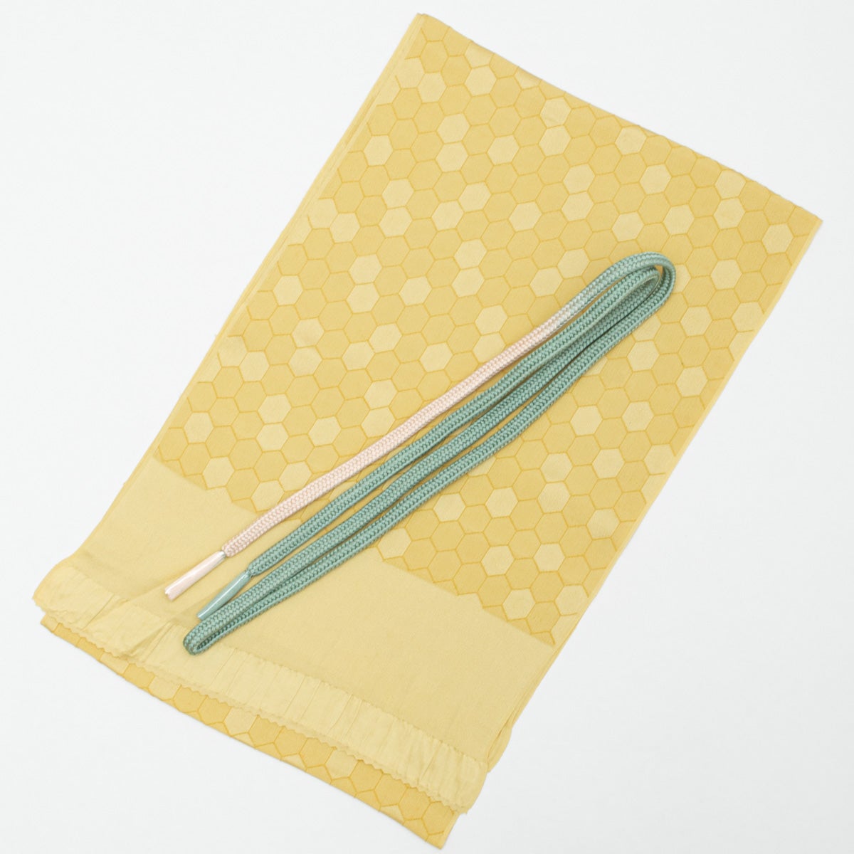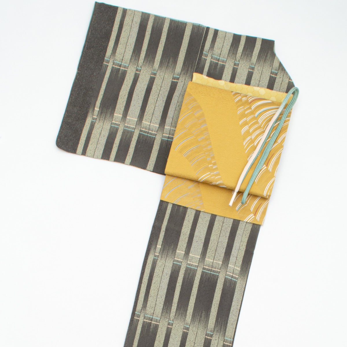 他の画像を見る 【小柄な方へおすすめ!しつけ糸付き!コーディネート】小紋 絣柄 モダン縞 青みのダークグレーと灰みの黄緑色と名古屋帯 幾何学柄 黄色 九寸のコーデ 13 新入荷 当店特別価格 ¥ 43,450 税込 カートに入れる お気に入りに登録する