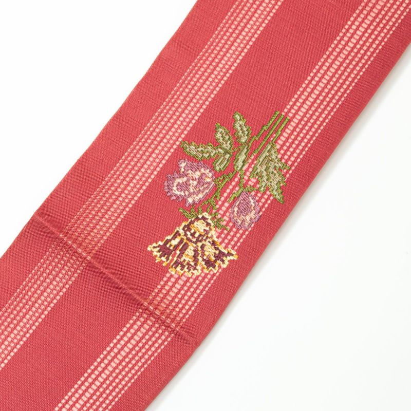 合わせた名古屋帯は、縞文様に優しい雰囲気の花をあしらった八寸名古屋帯です。