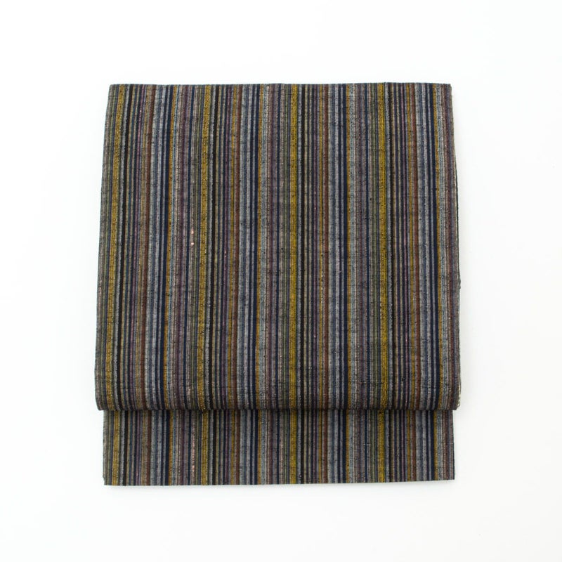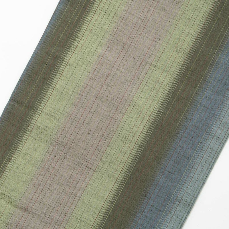■コメント紬 仄かな縞 灰みの緑 青 赤色と洒落袋帯 昼夜 粋縞 マルチカラーのコーディネートです。