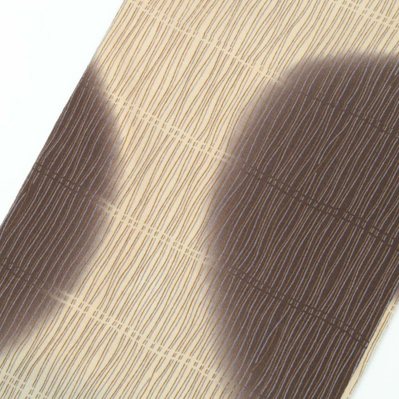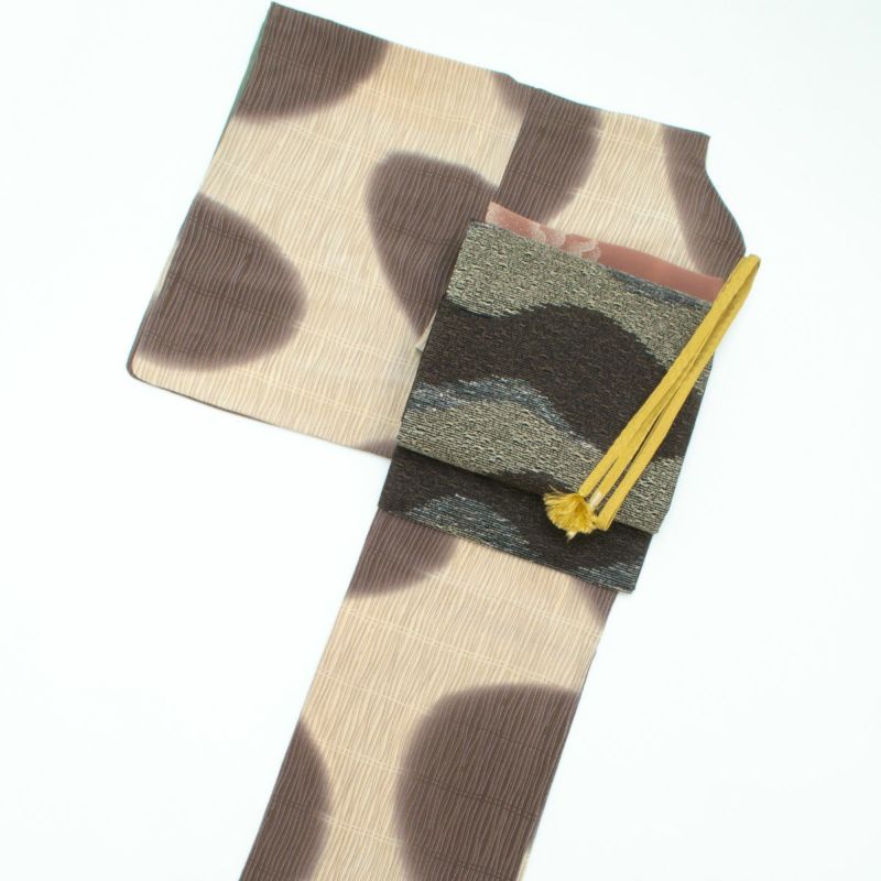 【コーディネート】小紋 縮緬 よろけ縞とモダン柄 ベージュ 灰みの紫色と洒落袋帯 よろけ段文様 焦茶 青 灰みの薄い黄色のコーデ 14