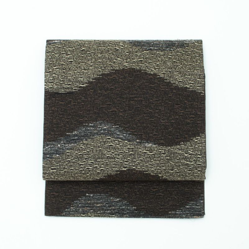 合わせた洒落袋帯は、焦茶・青・淡い黄色などの色彩を用いたよろけ段文様。
