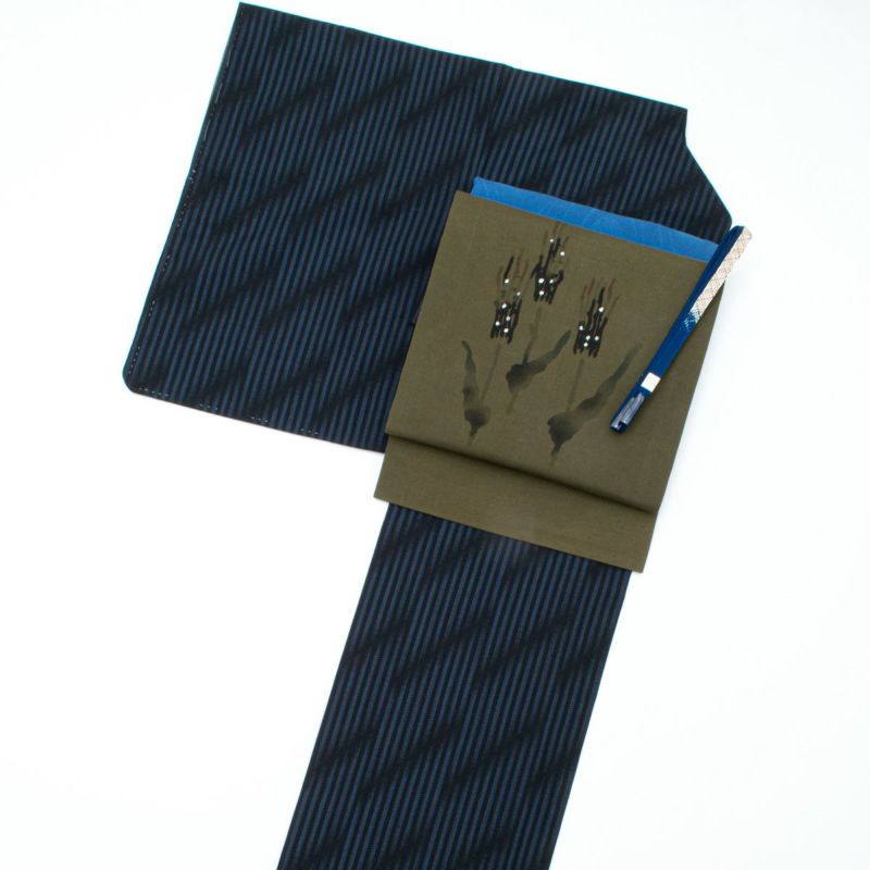 ■コメント紬 スタイリッシュ縞 黒 青色と名古屋帯 紬 植物 抽象柄 暗い灰みの黄緑色 九寸のコーディネートです。
