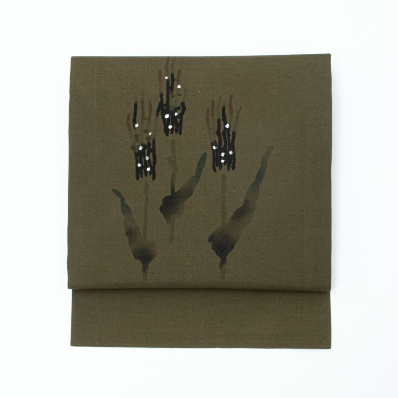 合わせた名古屋帯は、紬地に抽象的に描かれた植物文様がモダンなアクセントになっています。