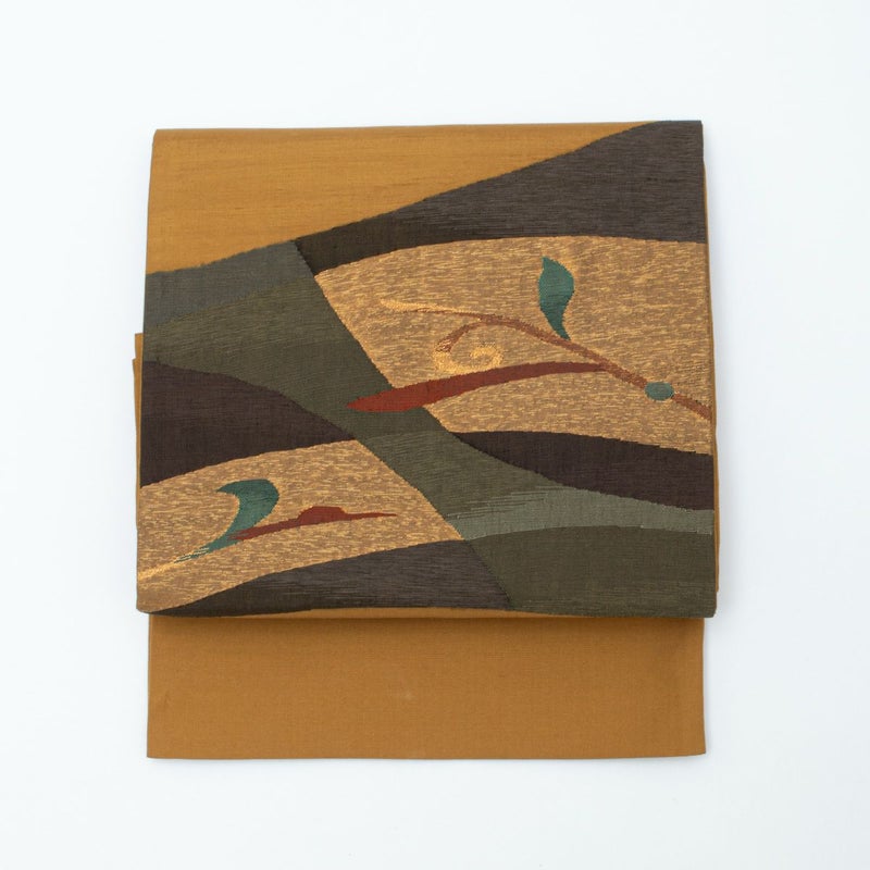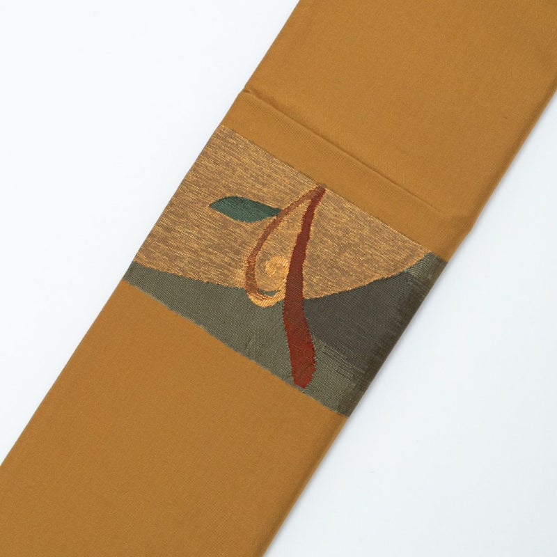 合わせた洒落袋帯は、灰みの橙色を基調にした抽象柄の使いやすい一本です。