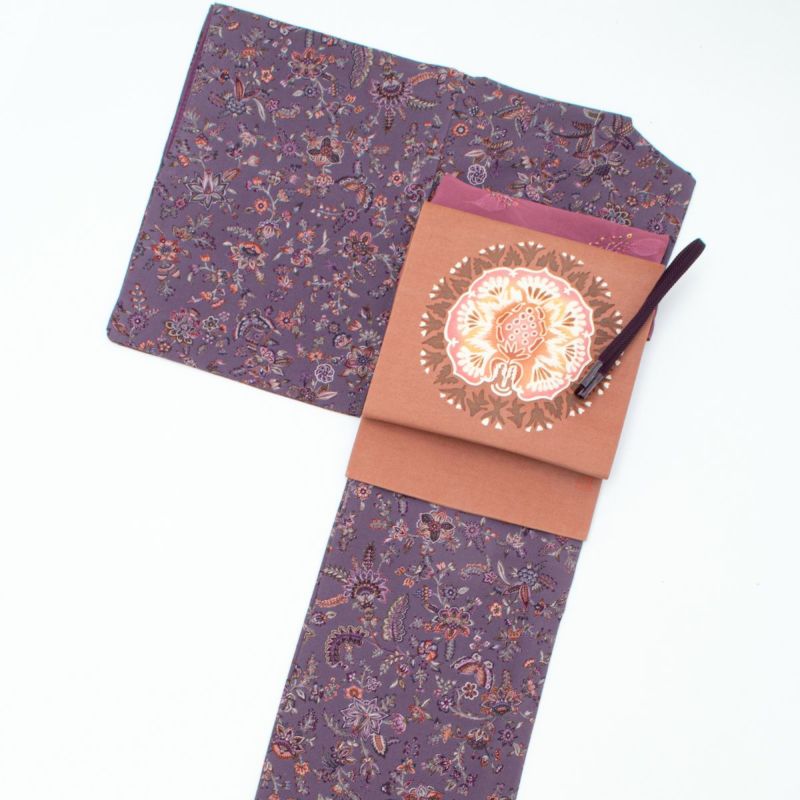 上品な紫地に、更紗文様が華やかに広がる小紋です。