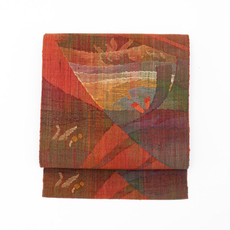青・橙・赤がリズミカルに並ぶ割り付け文の小紋に、真綿織ならではのやわらかな風合いを持つ赤茶色の