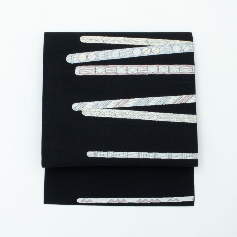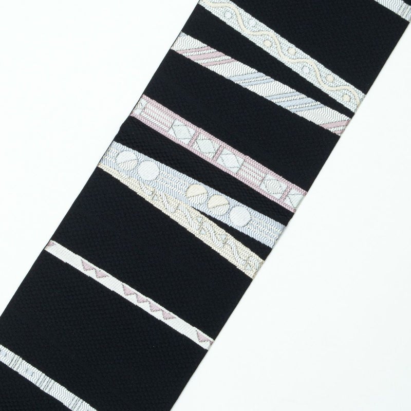 黒地に幾何学ラインが映える九寸名古屋帯の組み合わせです。