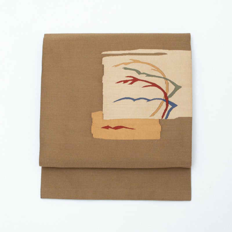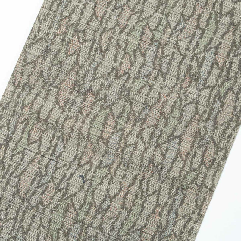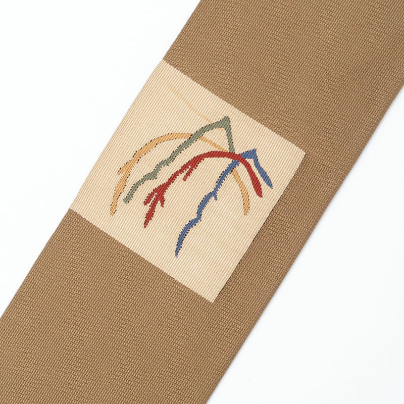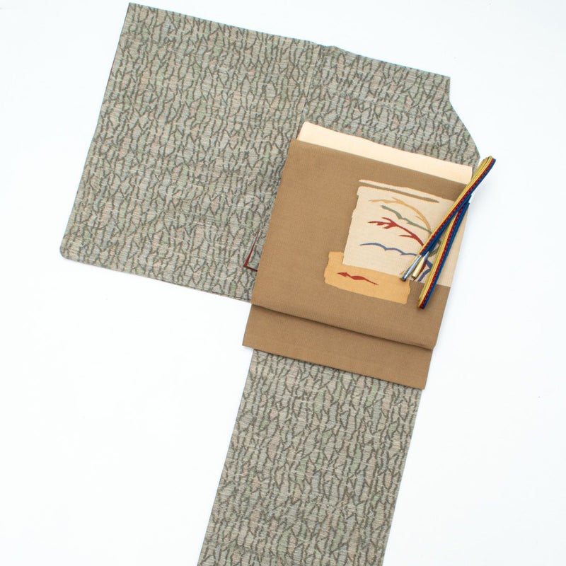 カーキ色の帯は、落ち着いた色調の中にほどよいデザイン性があり、お着物の穏やかな緑によく寄り添います。