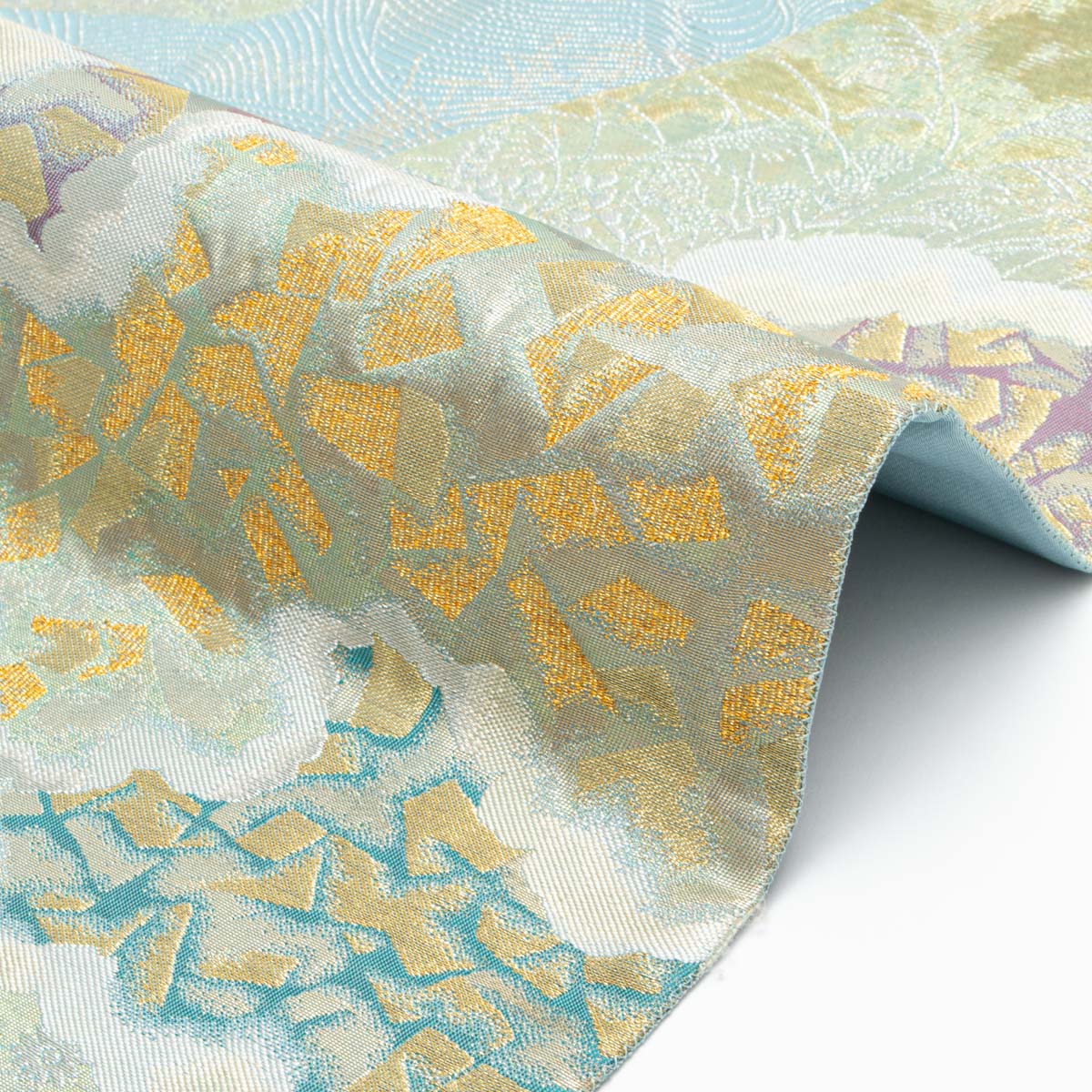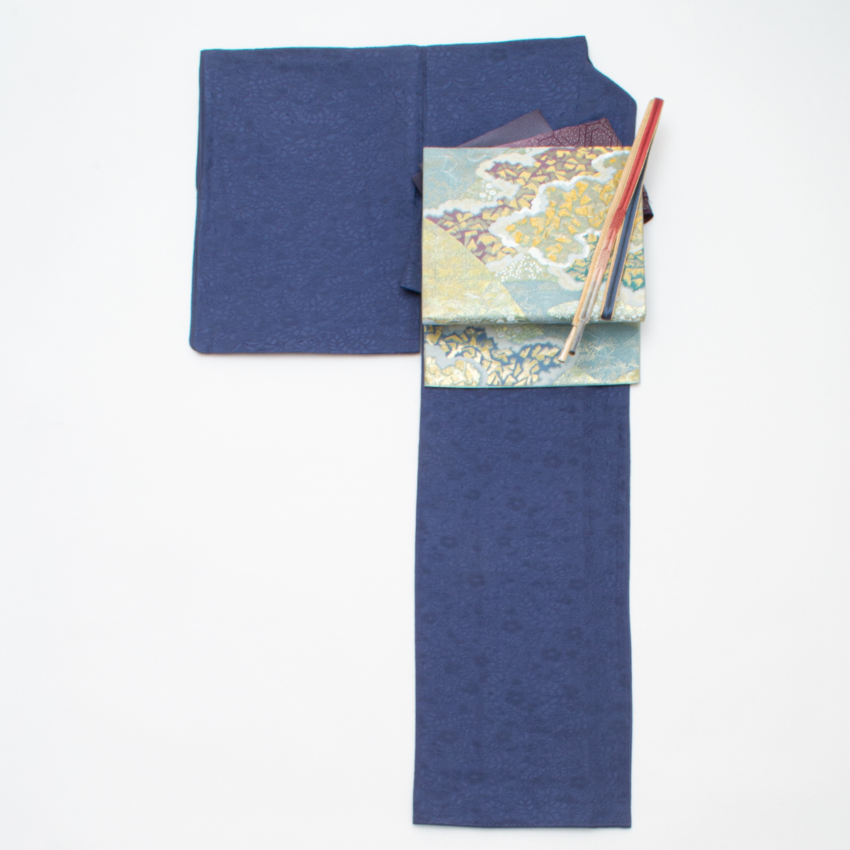 金銀の織りに水色を添えた配色が、群青色の着物に軽やかな華やぎを加えます。
