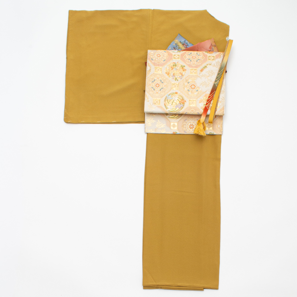 ■コメント色無地 一つ紋 黄土色と袋帯 蜀江文様 唐花紋 花丸紋 ピンク 白色のコーディネートです。