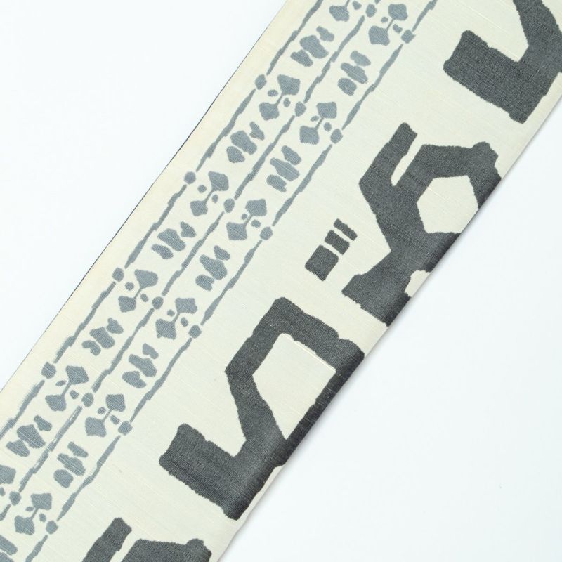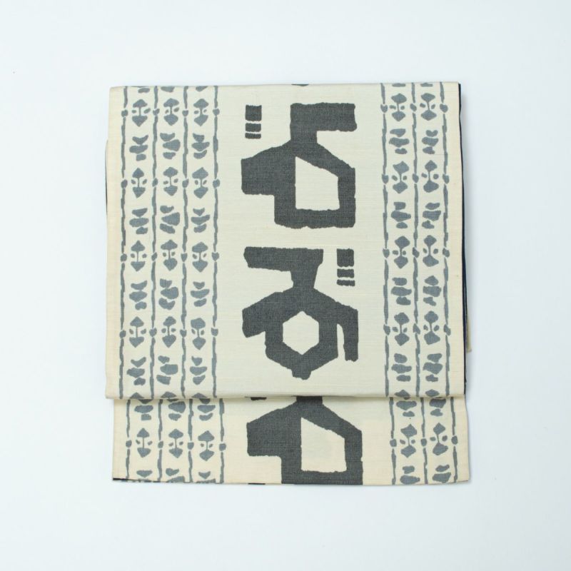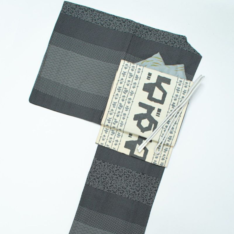 合わせた洒落袋帯は馴染みの良い木綿の素材で、紬地に黒、グレー、白をモダンに織りなしたシックな配色です。