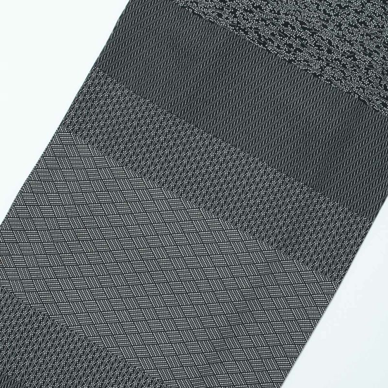 単衣 伊勢形紙 寄せ小紋 黒 白色と洒落袋帯 木綿 紬 黒 グレー 白色のスタイリッシュなコーディネートです。