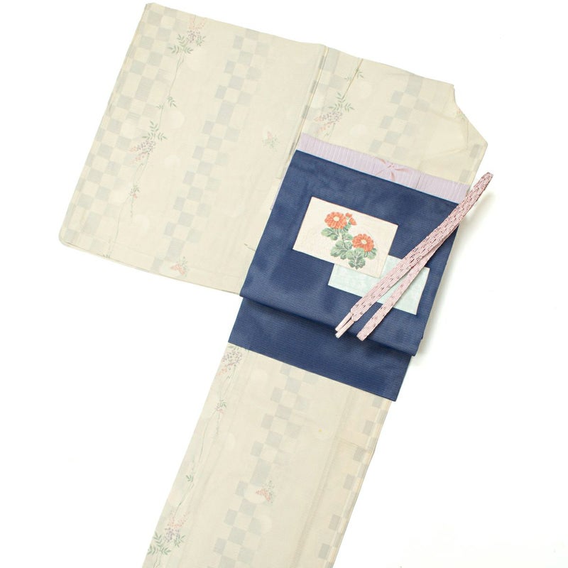 【コーディネート】夏着物 絽 小紋 市松 植物 淡黄色と夏名古屋帯 絽 菊 青色 九寸のコーデ 14