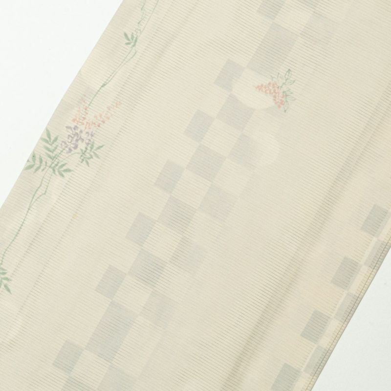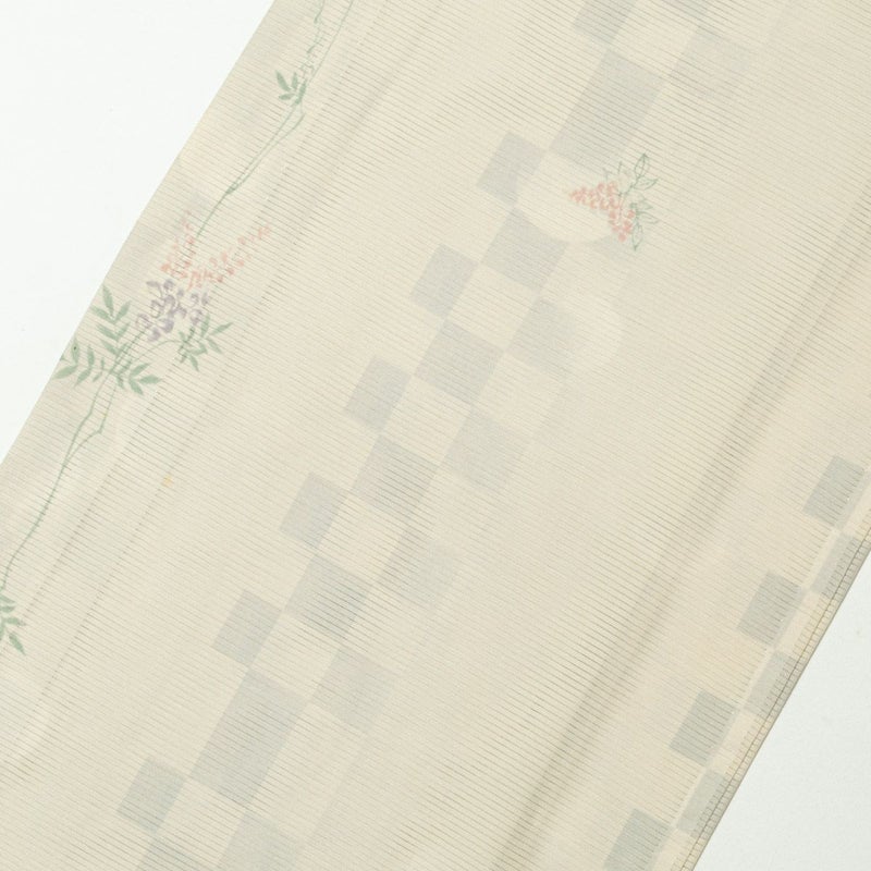 やさしい淡黄色の地に、市松と植物文様を織り交ぜた夏の絽の小紋です。