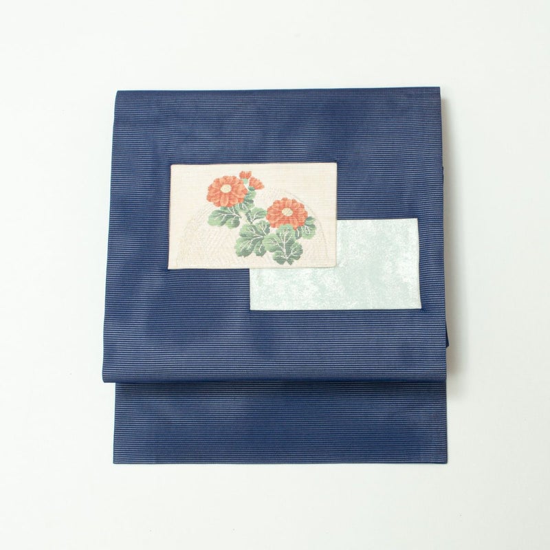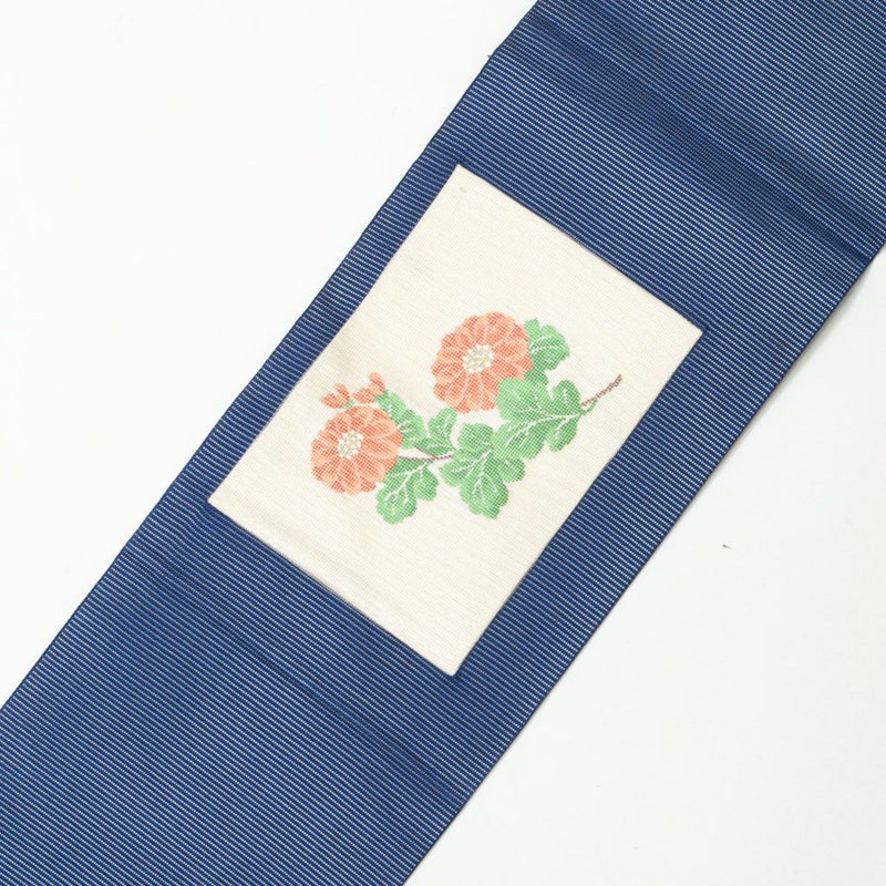 合わせた帯は、青色の絽地に菊の文様が咲く夏名古屋帯です。