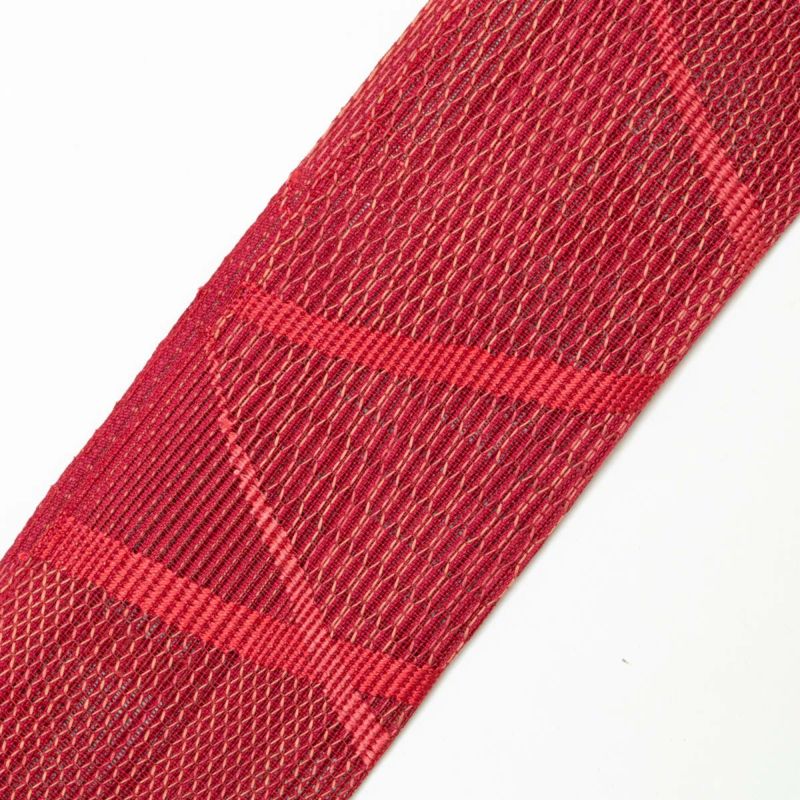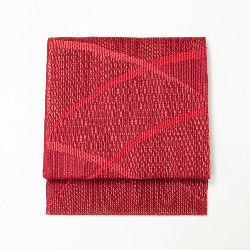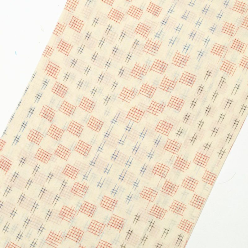 生成り地に井桁絣があしらわれ、赤と黒のアクセントがモダンな印象を添えます。