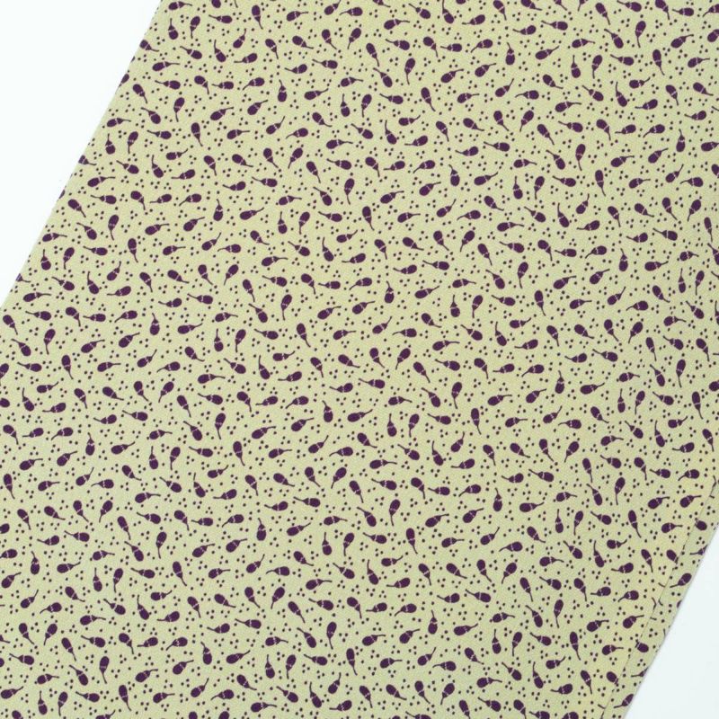 小紋 茄子柄 淡い黄緑 紫色と名古屋帯 愛らしい花柄 暗い紫色 九寸のコーディネートです。
