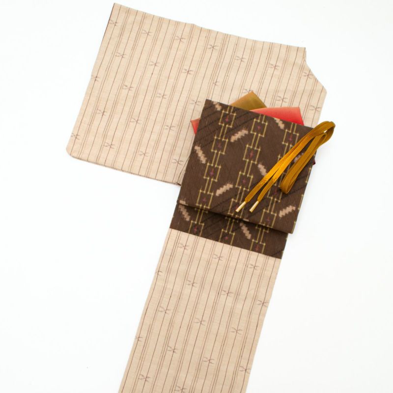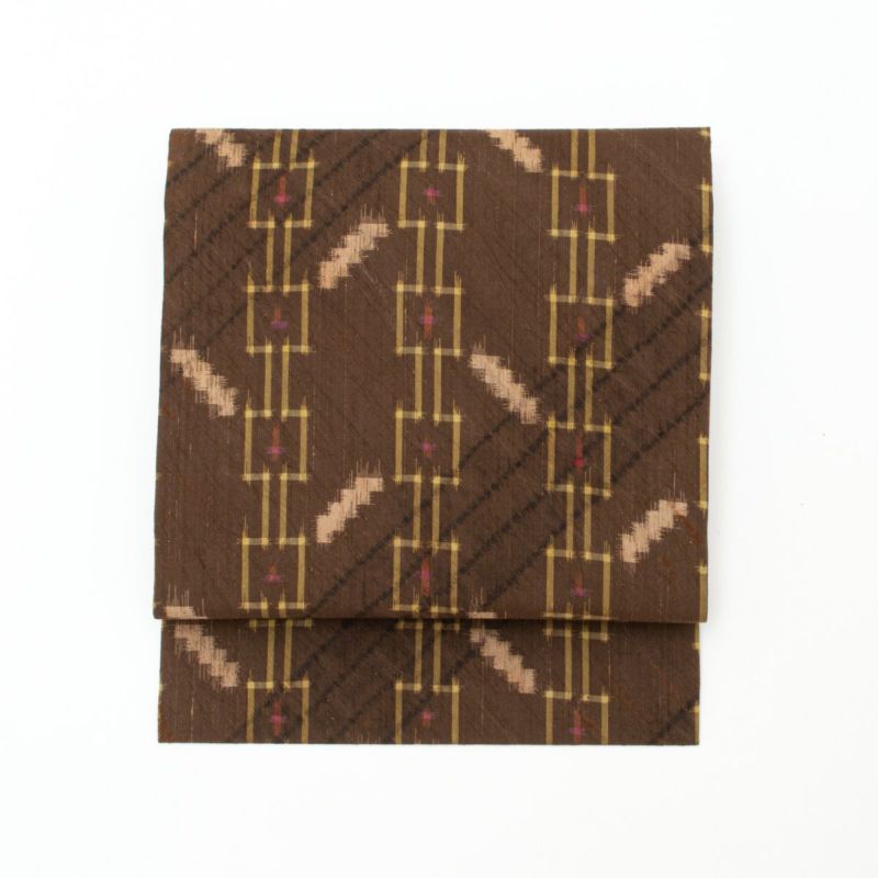 合わせた名古屋帯は、焦茶色を基調に絞りを取り入れた幾何学柄の紬帯です。