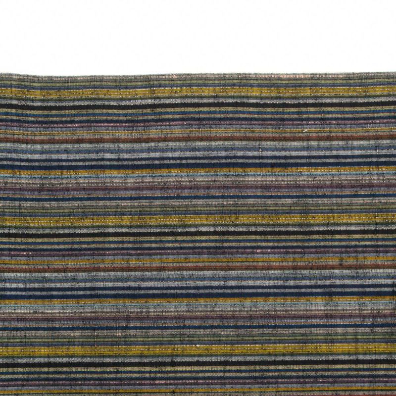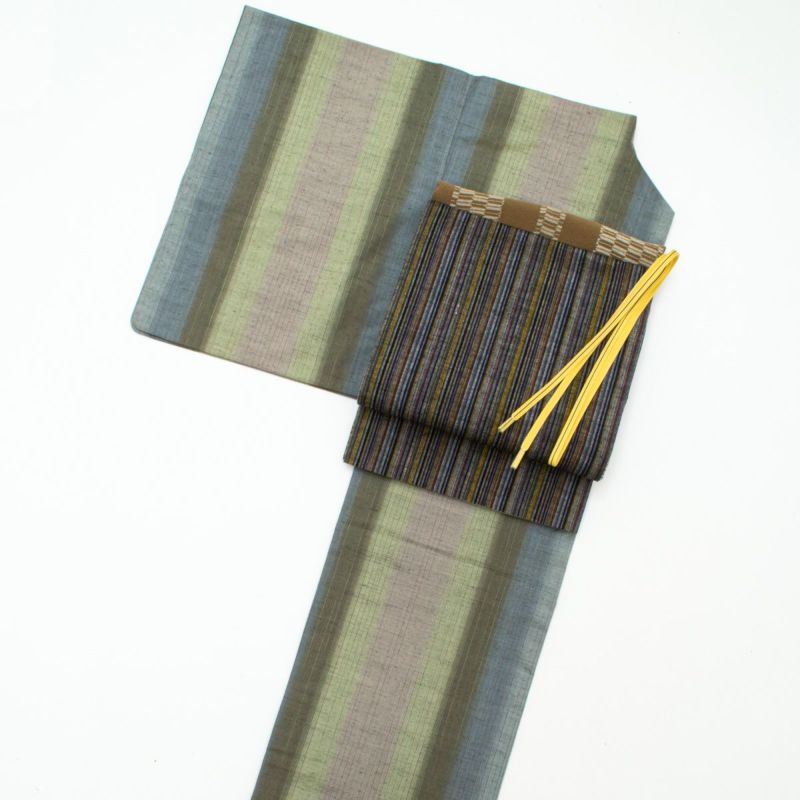 灰みを帯びた色彩を基調に、縞模様を織りなしたの紬のお着物です。