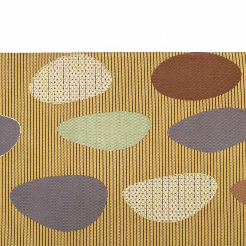 ■コメント小紋 抽象柄 黒茶 灰みの黄色と洒落袋帯 縞と抽象柄 灰みの黄色 マルチカラーのコーディネートです。