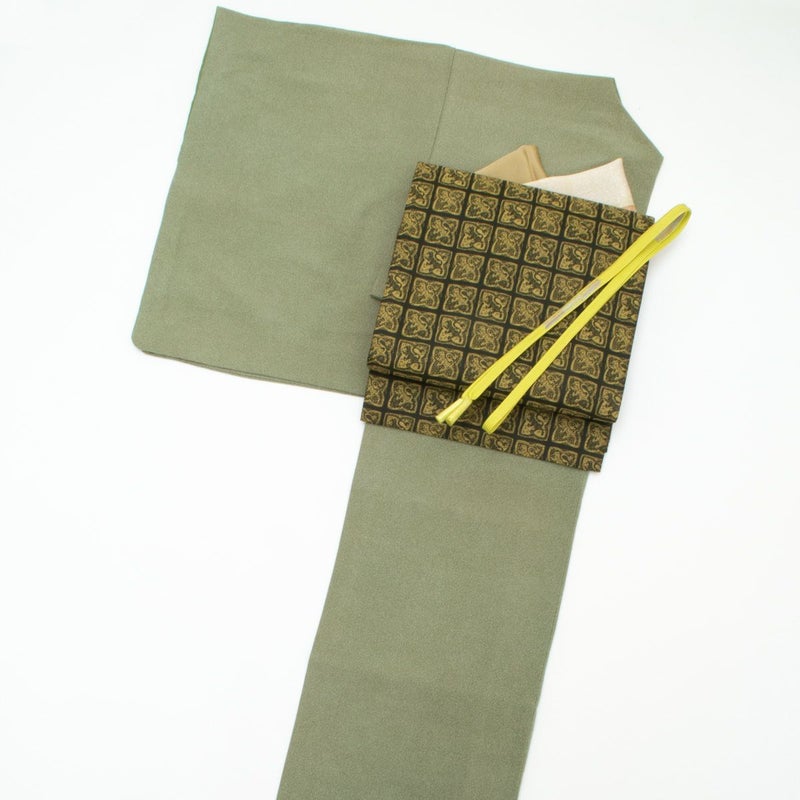 ■コメント江戸小紋 紋無し 大小あられ 灰みの緑色と洒落袋帯 幾何学と獅子柄 灰みの黄緑色のコーディネートです。