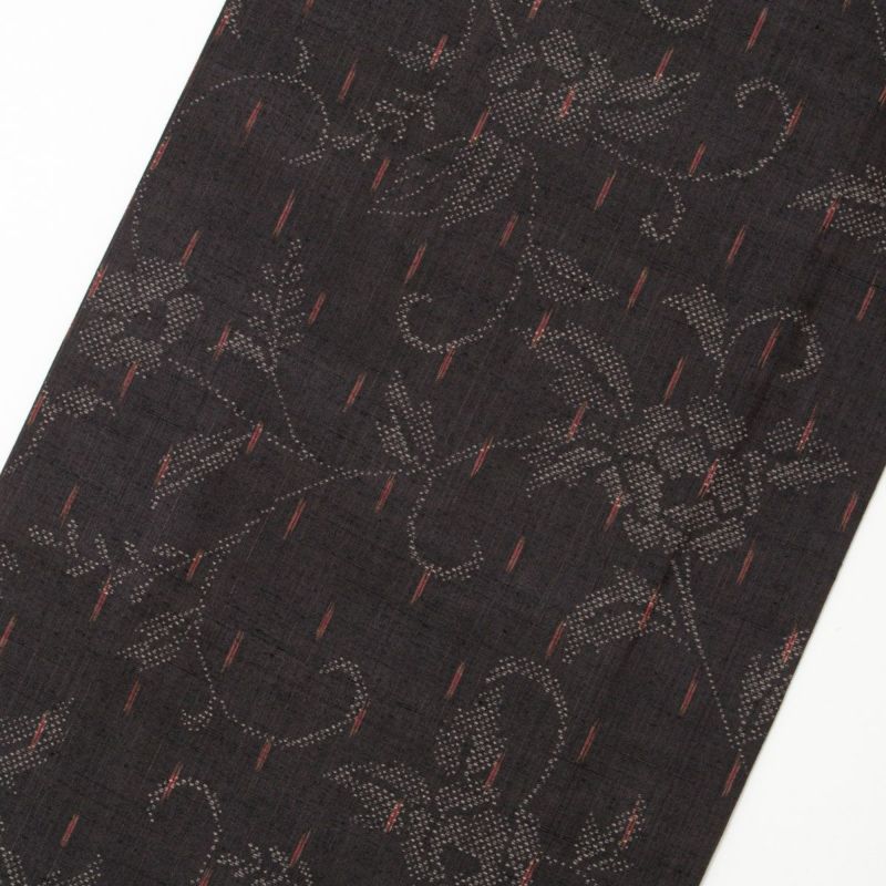 黒地に唐草文様と赤いポイントカラーが映える紬に、よろけ文様を織りなした京袋帯のコーディネートです。