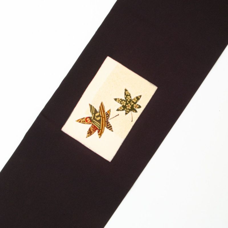 ■コメント紬 縞 茶色 マルチカラーと名古屋帯 葉柄 アップリケ 暗い紫色 マルチカラー 九寸のコーディネートです。