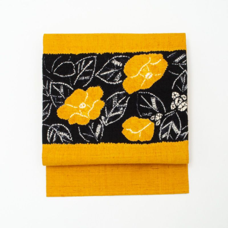 灰みの緑と茶色の縞がやわらかに調和した絞りの紬に、山吹色の地に椿をあしらった