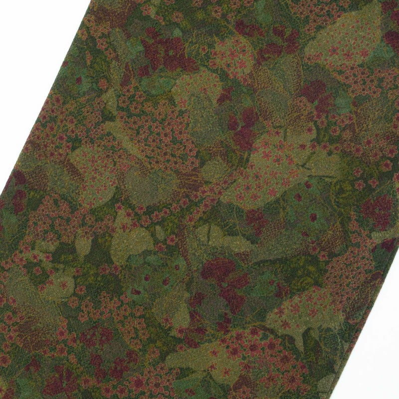 ■コメント小紋 縮緬 ボタニカル 緑 紫色と名古屋帯 真綿織 流線 幾何学柄 赤紫色 八寸のコーディネートです。
