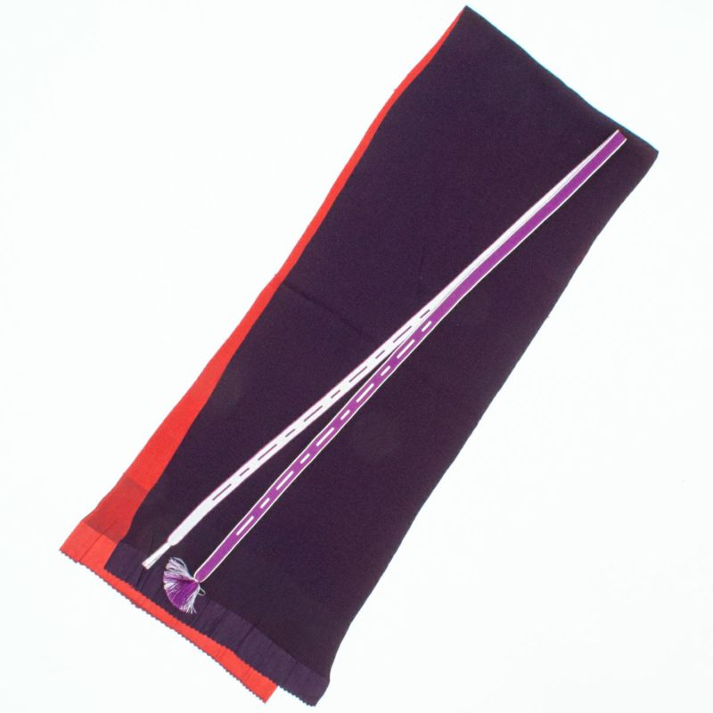 白地に紺と赤の彩りが美しく、モダンなデザインが個性的でお洒落な帯です。
