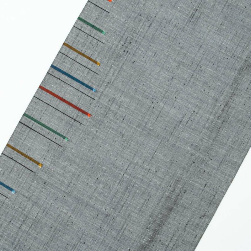 柔らかな灰色の真綿織の紬に、カラフルな変わり縞が映える一枚です。