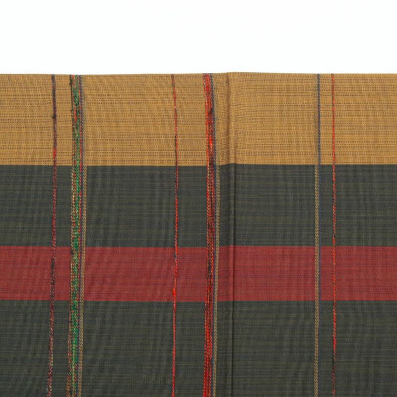 合わせた洒落袋帯は、煉瓦や辛子色を基調にしたモダンな縞柄が印象的なお品です。
