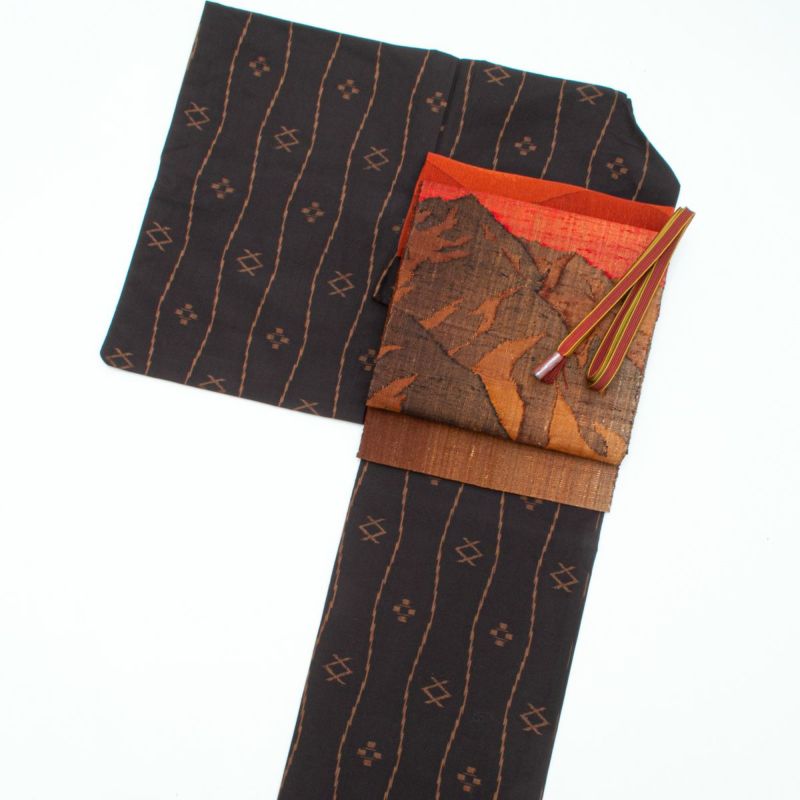 【コーディネート】紬 越布琉 絣 焦茶色と名古屋帯 紬 山脈 茶系 八寸のコーデ 13