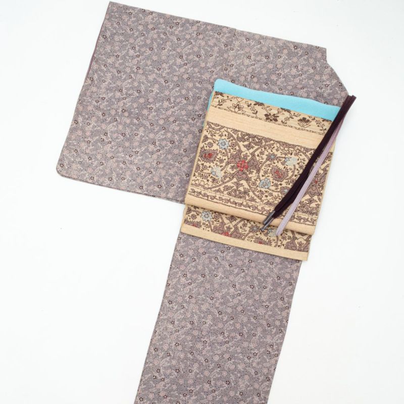 藤鼠に紫がやさしく映える小花柄の小紋に、ベージュを基調とした段替わりの花唐草帯を合わせたコーディネートです。