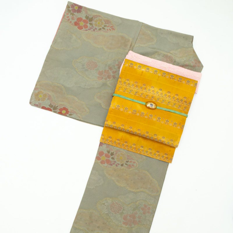 灰みの緑色がしっとりと映える辻が花の小紋に、鈍い黄色の西陣小花柄帯を合わせた上品なコーディネートです。