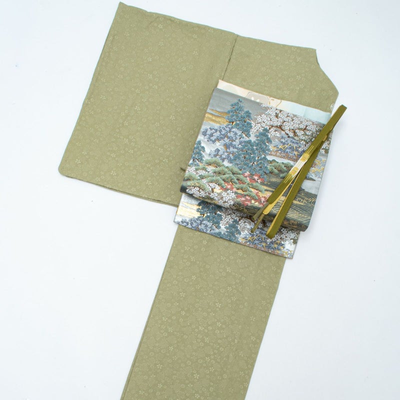 灰みの黄緑色がやわらかに品よく映える一つ紋の色無地に、流水に松・桜・紅葉を織り出した袋帯を合わせた