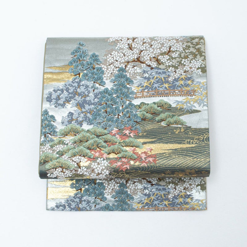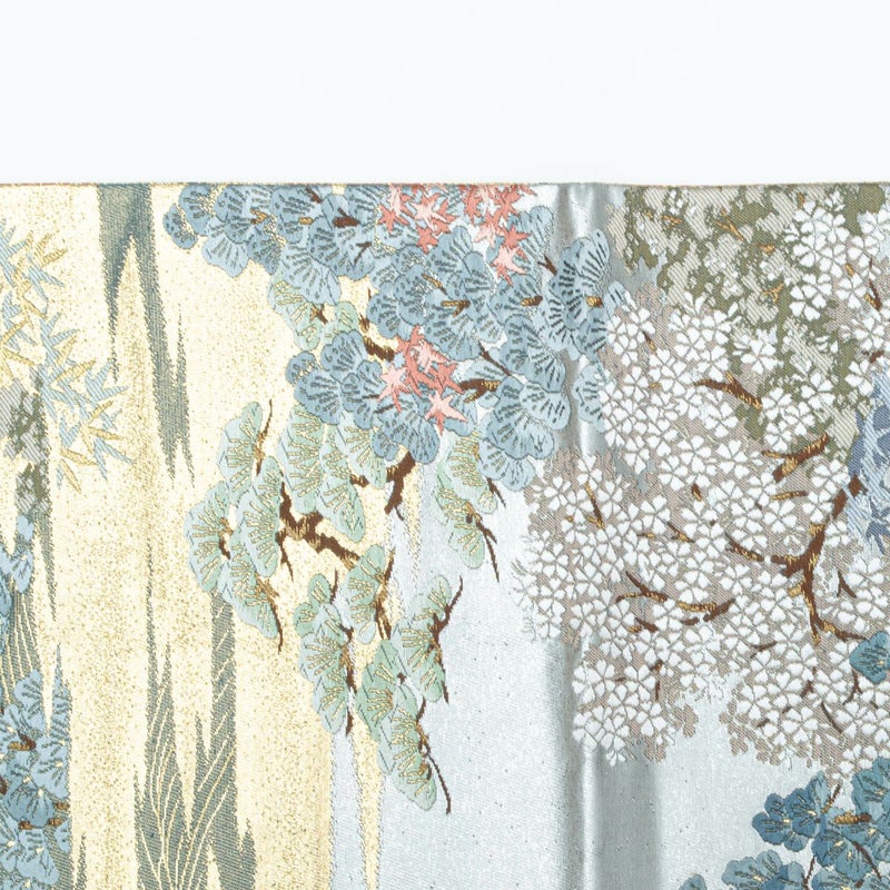 ■コメント色無地 一つ紋 灰みの黄緑色と袋帯 流水に松 桜 紅葉 灰みの青色 マルチカラーのコーディネートです。