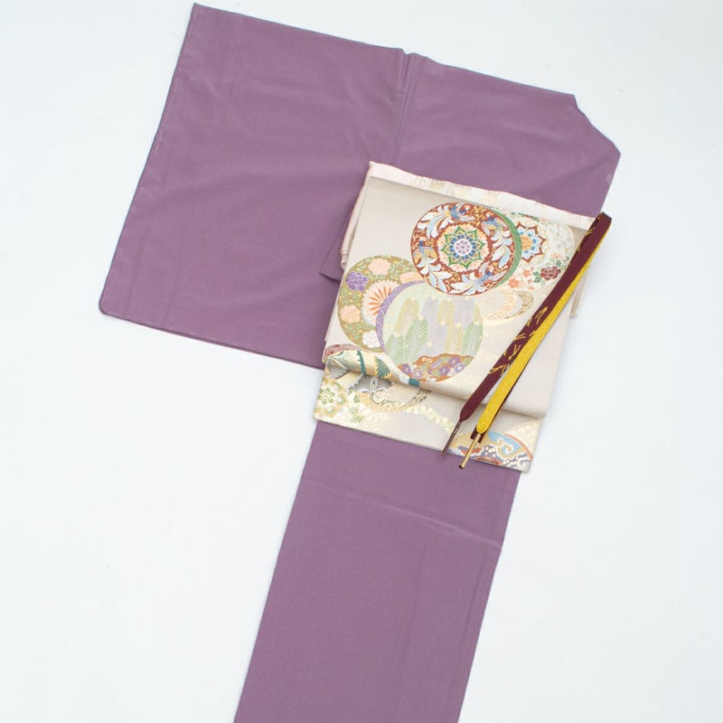 ■コメント色無地 一つ紋 藤色と袋帯 丸に有職文様と植物柄 オフホワイト マルチカラーのコーディネートです。