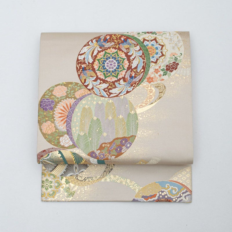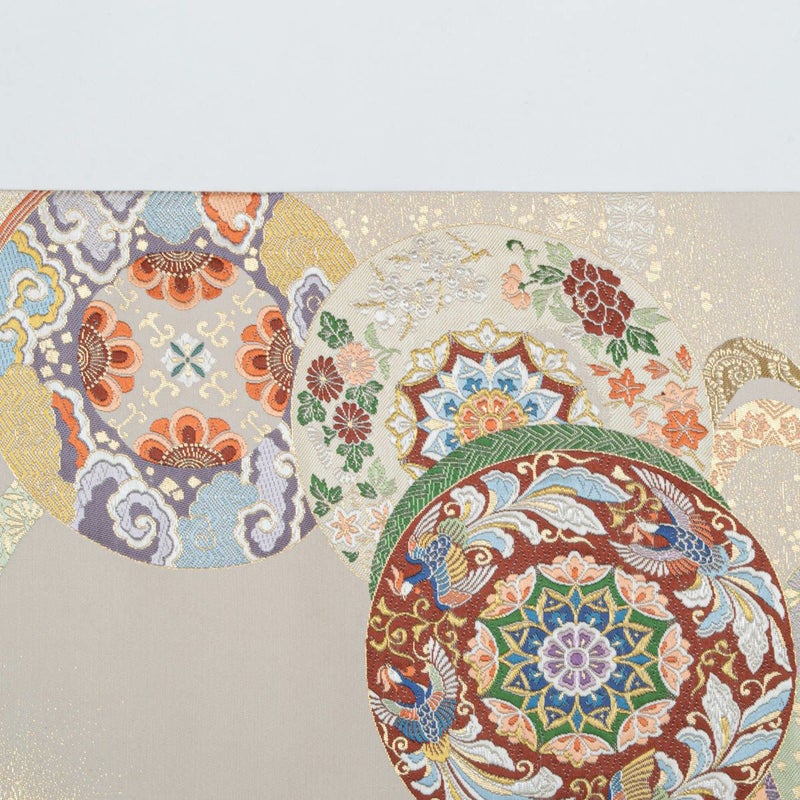 合わせた袋帯は、丸に有職文様と植物柄を配した格調高い意匠。