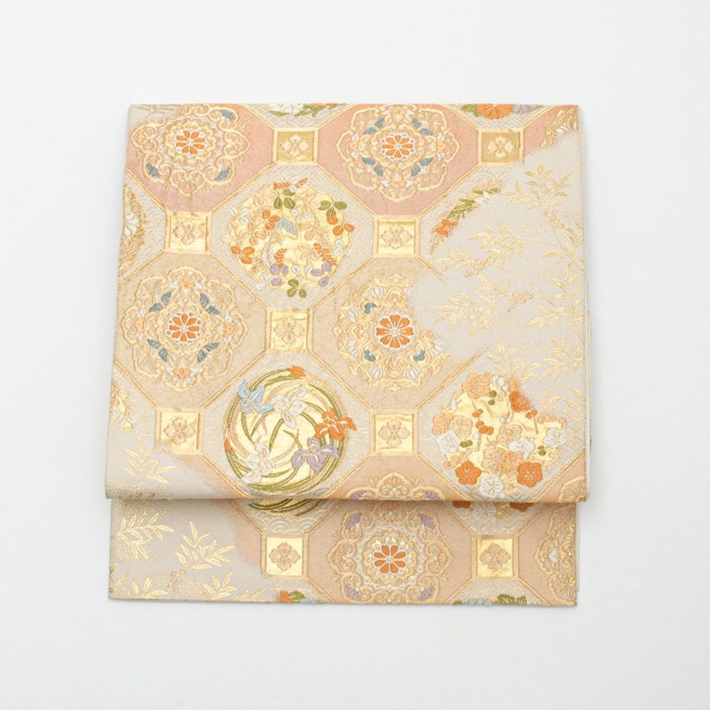 合わせた袋帯は、蜀江文様に唐花紋や花丸紋をあしらった華やかな一本。