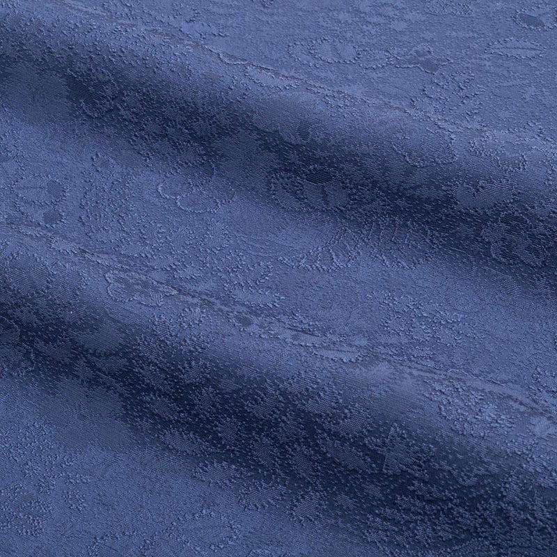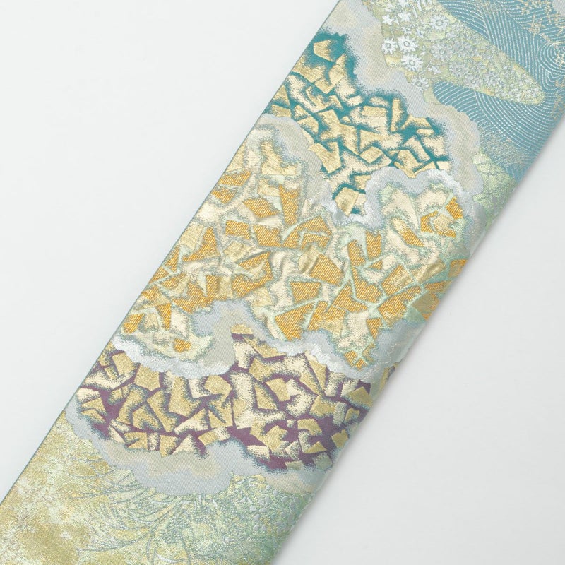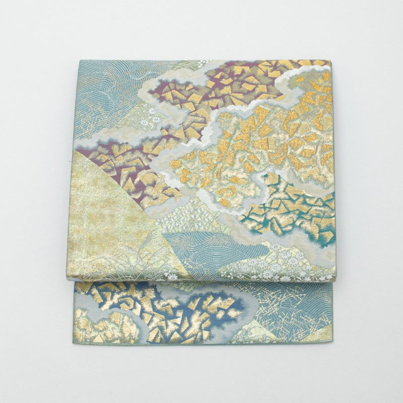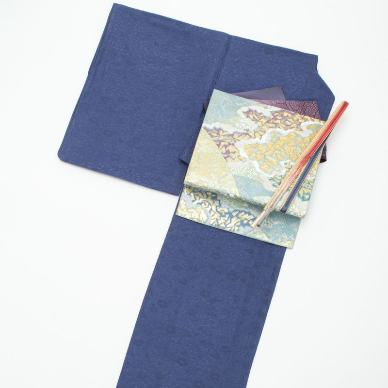 金銀の織りに水色を添えた配色が、群青色の着物に軽やかな華やぎを加えます。