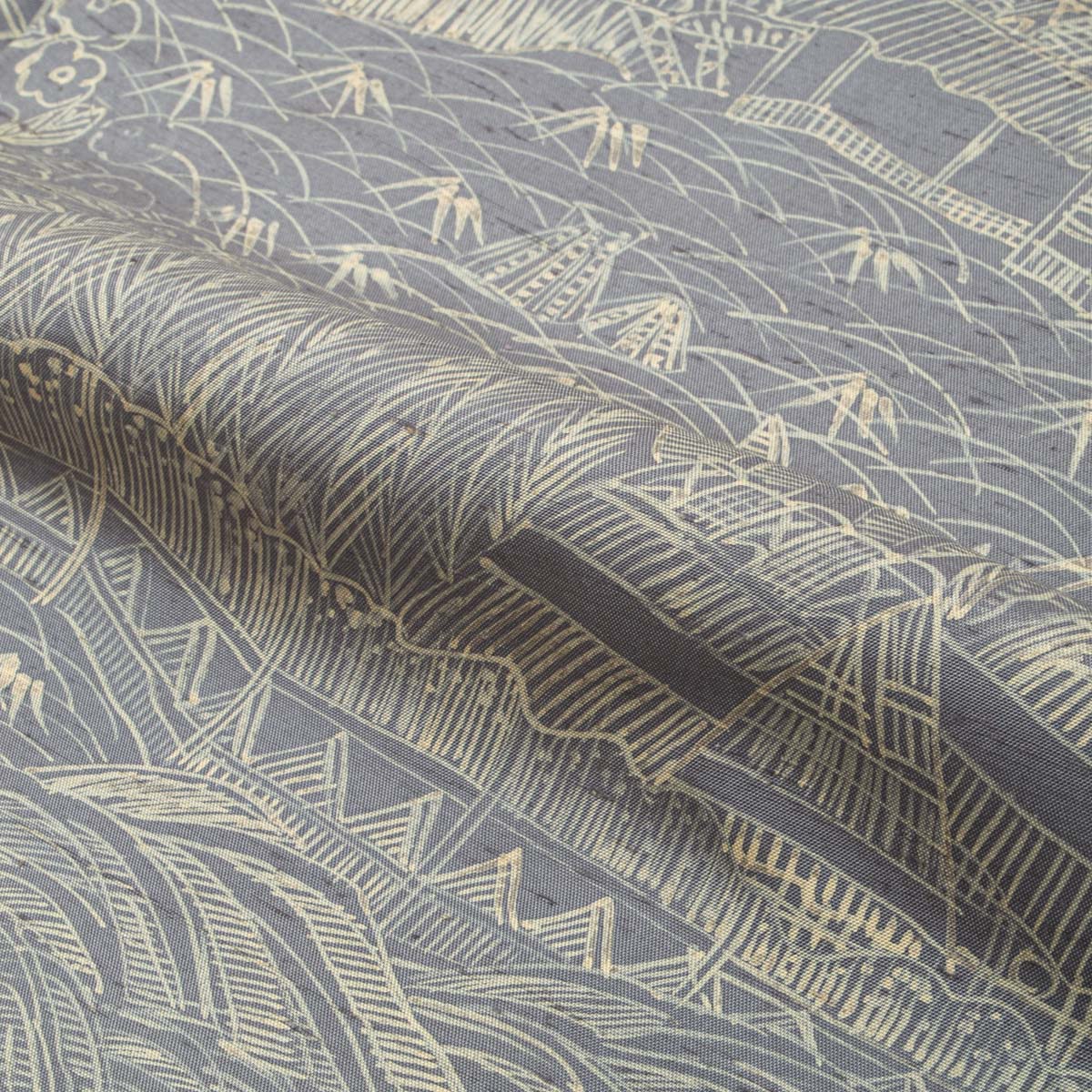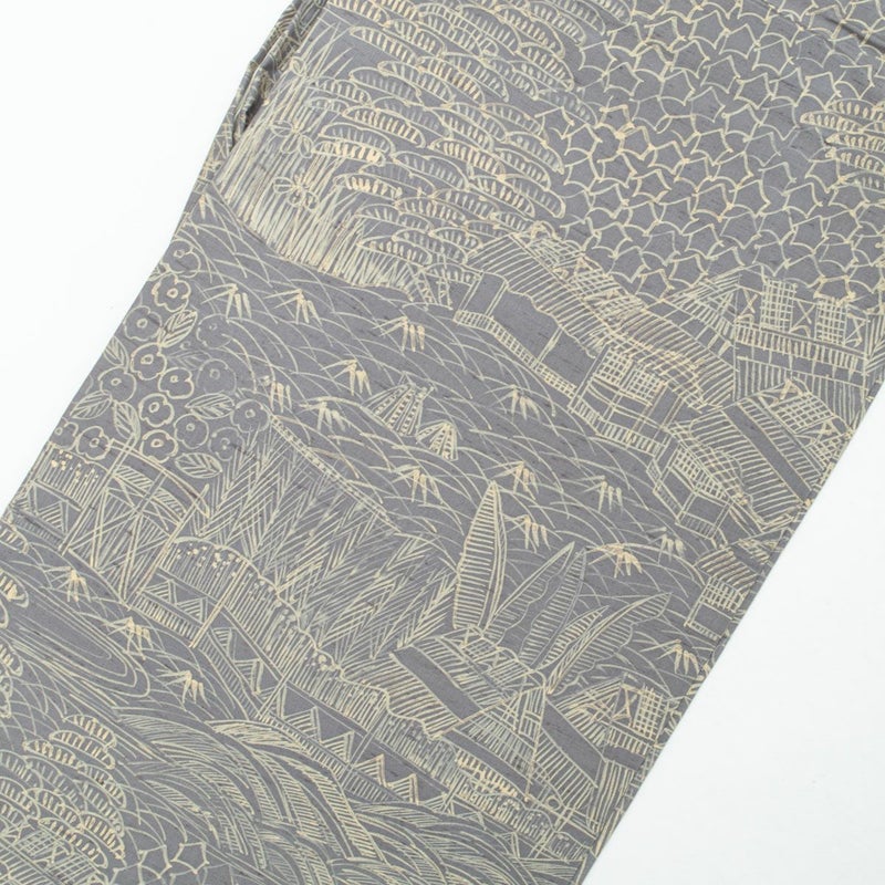 落ち着いたグレー色の地に、風景画を描いた趣深い紬です。