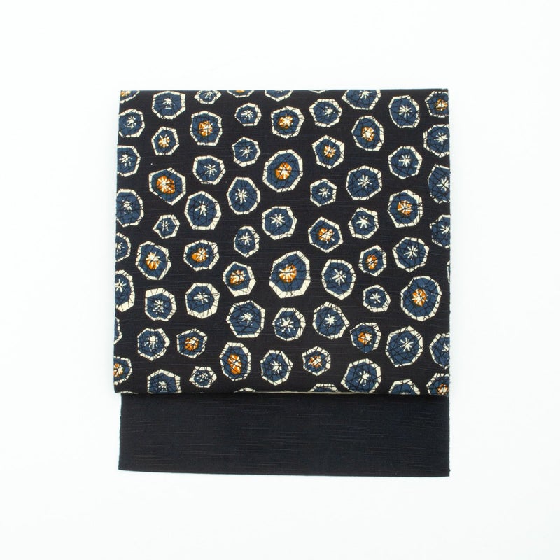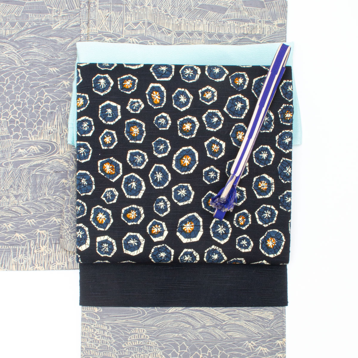合わせた名古屋帯は、木綿素材の幾何学柄です。