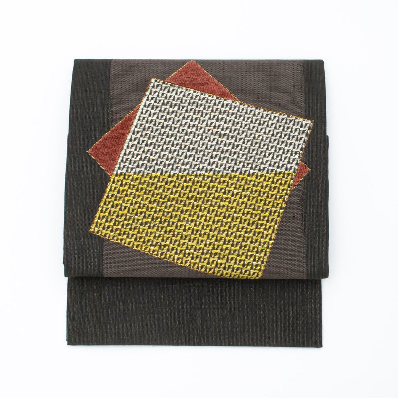 合わせた洒落袋帯は、モダンな四角文様を配した意匠です。